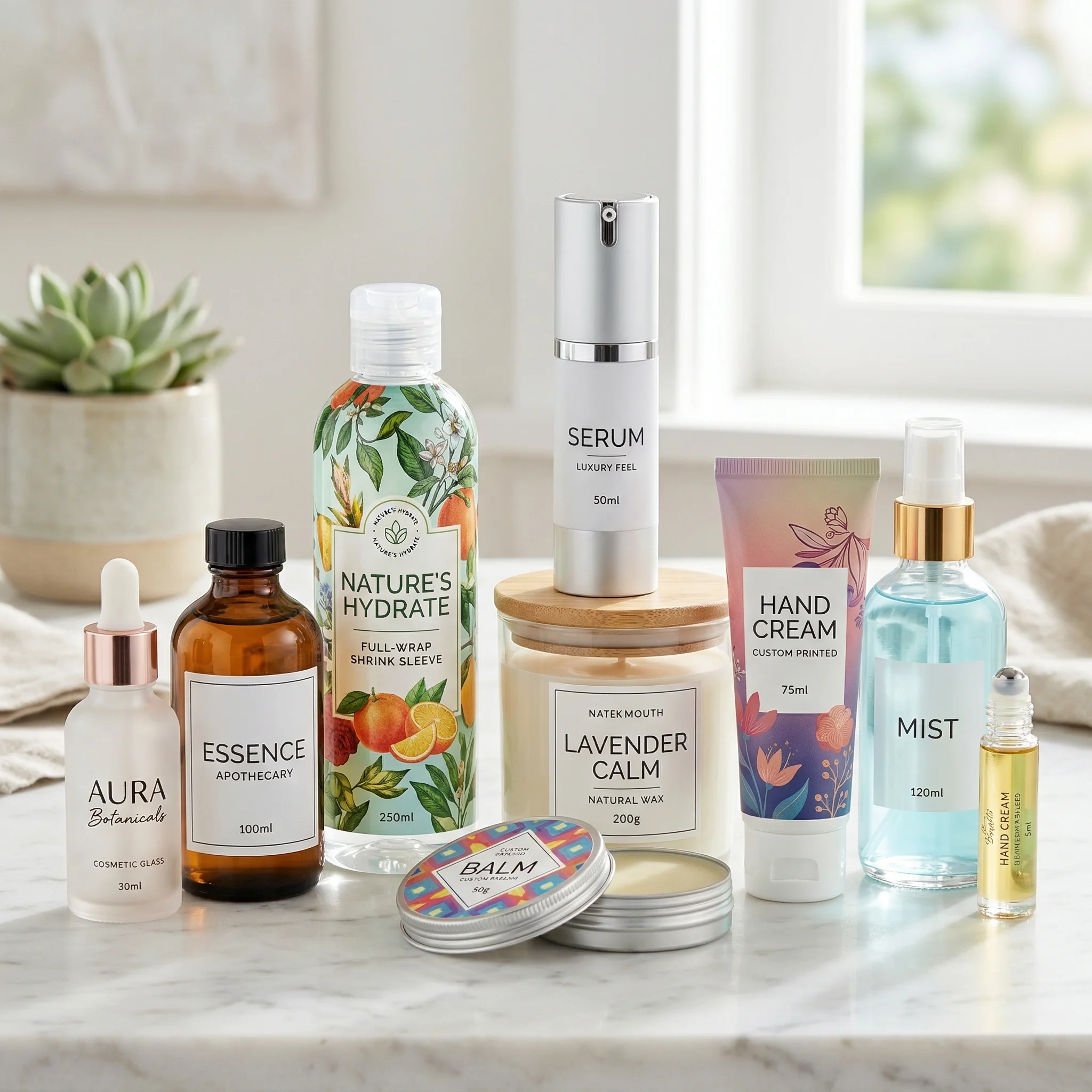 Custom bottles (plastic & glass), jars, squeeze tubes, cylinder tube boxes, tins, clamshell containers, dropper bottles, spray bottles, pump bottles, and airless pump bottles.