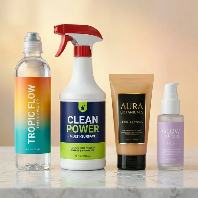 PET, HDPE, or LDPE bottles in stock or custom molds. Common for beverages, cleaners, and lotions.