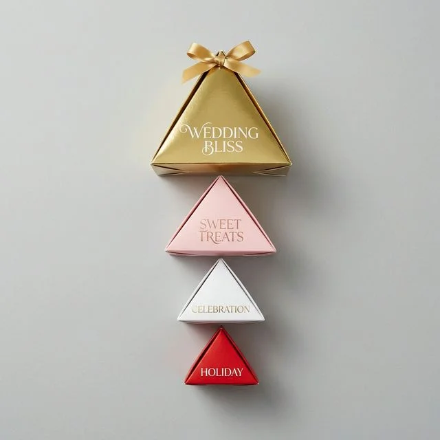 Triangular pyramid-shaped boxes for weddings, holiday treats, and gift packaging that stands out.