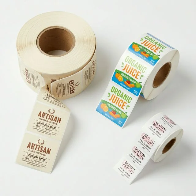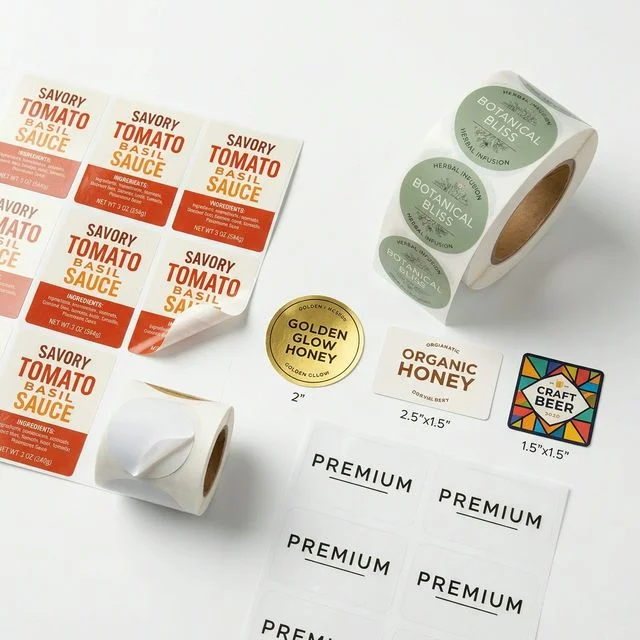 Custom labels and stickers including roll labels, sheet labels, waterproof, clear, metallic, kraft, bottle, nutritional, warning, barcode, QR code, NFC, tamper-evident, holographic, embossed, die-cut, kiss-cut, vinyl, and more.