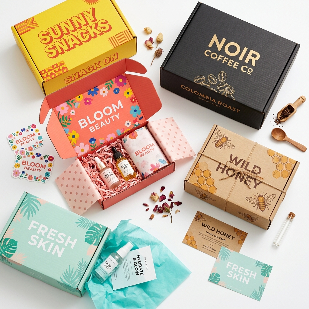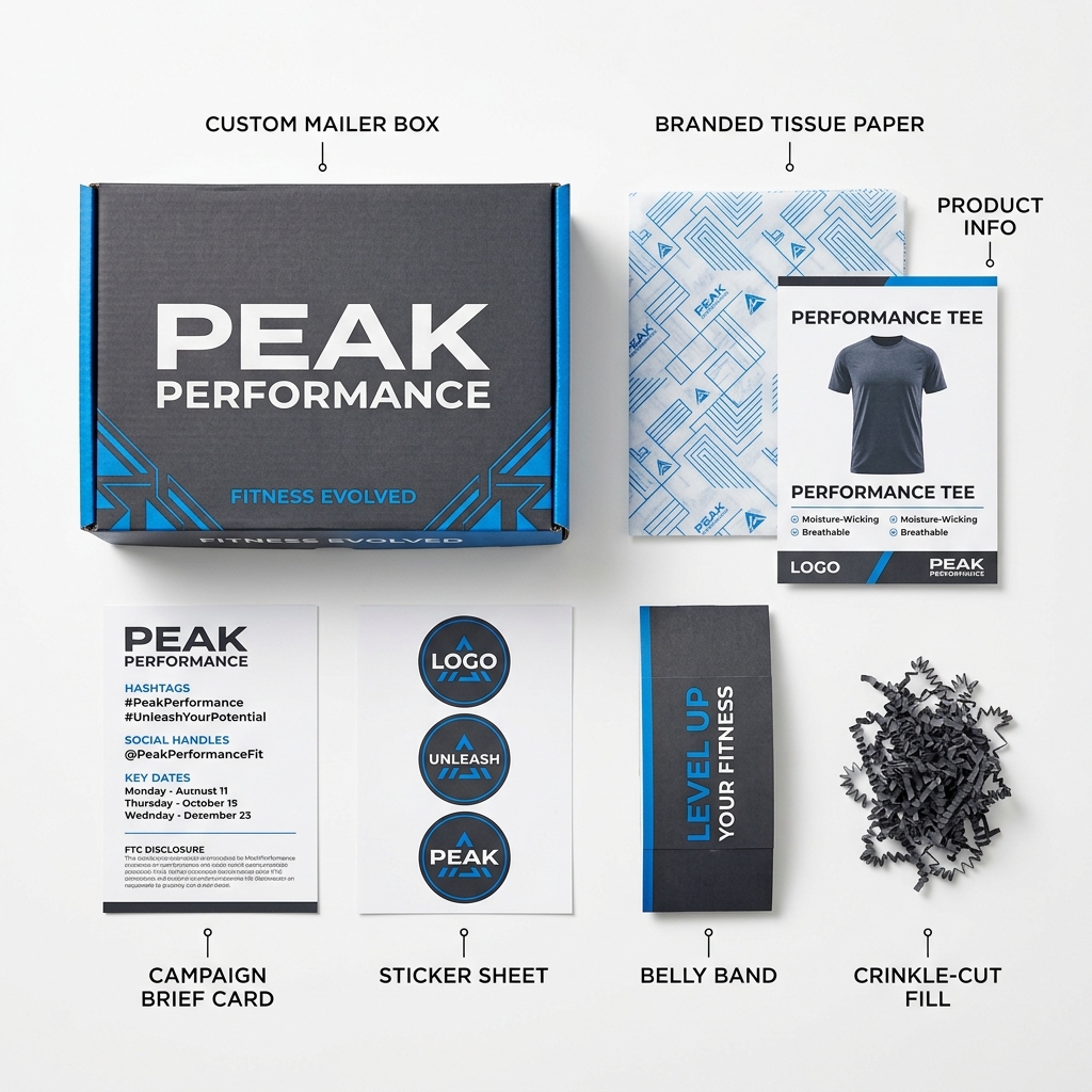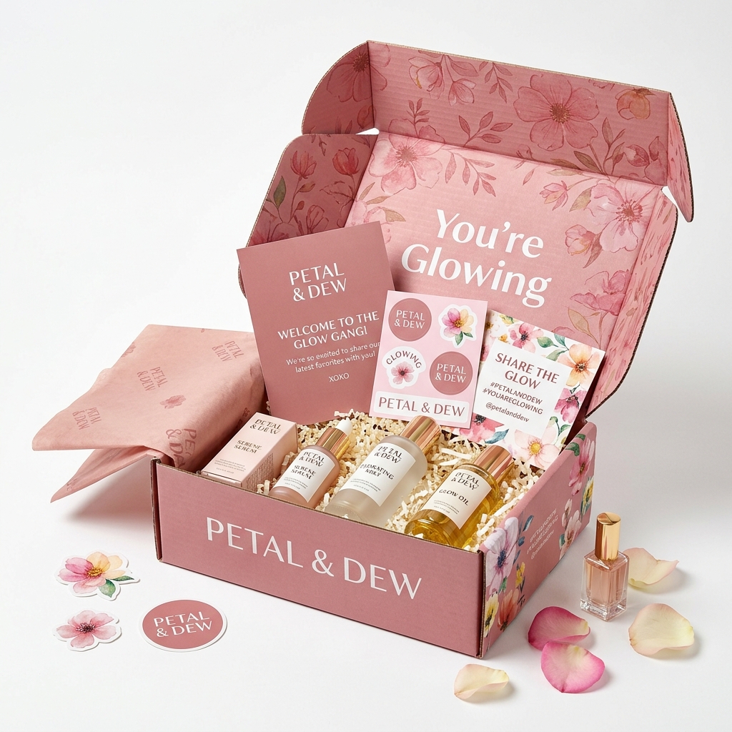 Full-kit influencer mailers with custom printing, branded tissue, cards, and stickers. Perfect for micro-influencer campaigns.